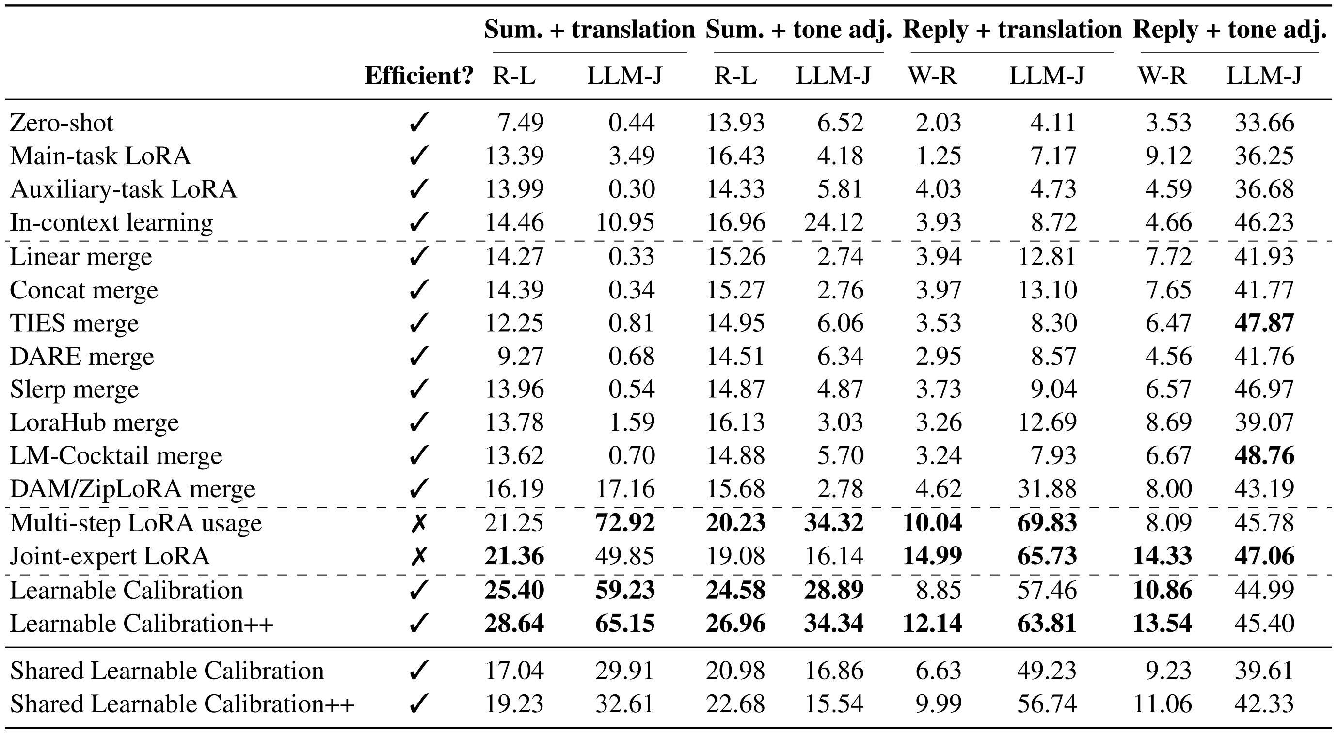 such as Main-task LoRA and Linear Merge, are efficient but exhibit significantly